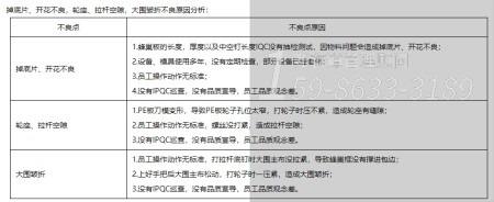 二、分析品質不良問題點。對于很多員工不清楚各不良點所占比例不清楚、品質改善沒重點,沒方向的情況。邦有道管理咨詢公司提出分析各不良點所占比例,根據不良點比例,項目老師和車間主任、QC組長確認品質改善點,選取掉底片、開花不良,輪座、拉桿空隙,大圍皺折這三項為品質改善的重點。