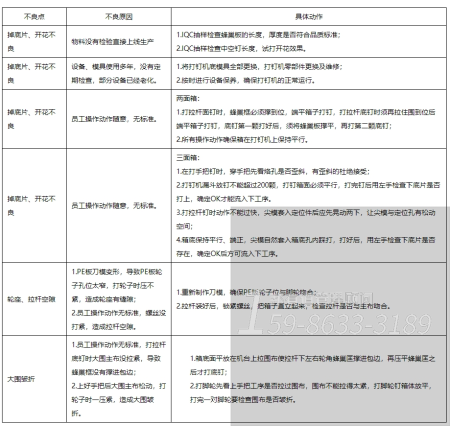 四、制定改善問題關鍵點。因沒有品質目標、員工操作動作隨意的原因,導致持續無法改善后,慢慢地將問題變成常態的情況,專業精益生產管理咨詢公司先是攻關會議討論確定打釘車間品質目標,二面箱不良率為4%,三面箱不良率為5%;項目組老師將打釘車間關鍵工序拍攝視頻,每道工序由打釘車間主任和員工各做一次形成對比;由員工自己發言,總結自己操作動作的亮點與不足的地方。其中具體的改善動作如下: